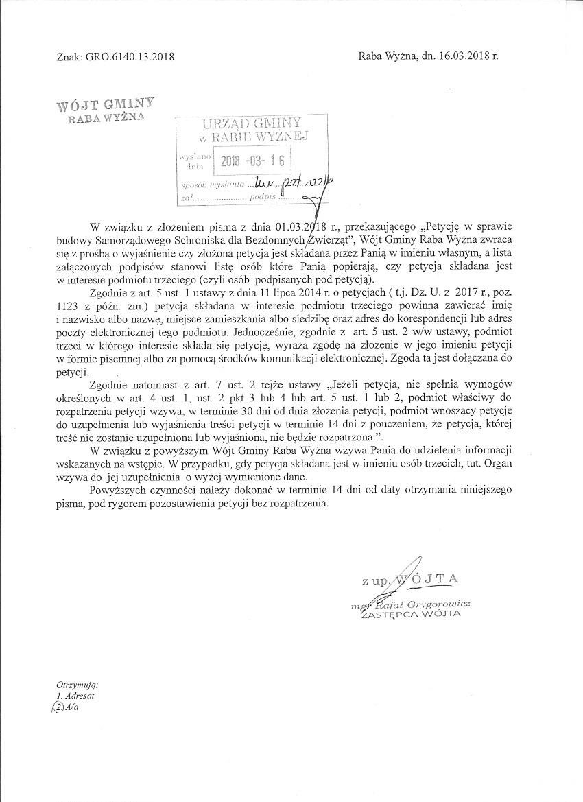 to w terminie 30 dni od dnia złożenia petycji zwrócimy się do ciebie o uzupełnienie lub wyjaśnienie treści petycji w terminie 14 dni od otrzymania wezwania. Jeżeli nie usuniesz braków lub nie złożysz wyjaśnień co do treści petycji w w/w terminie pozostawimy ją bez rozpatrzenia.