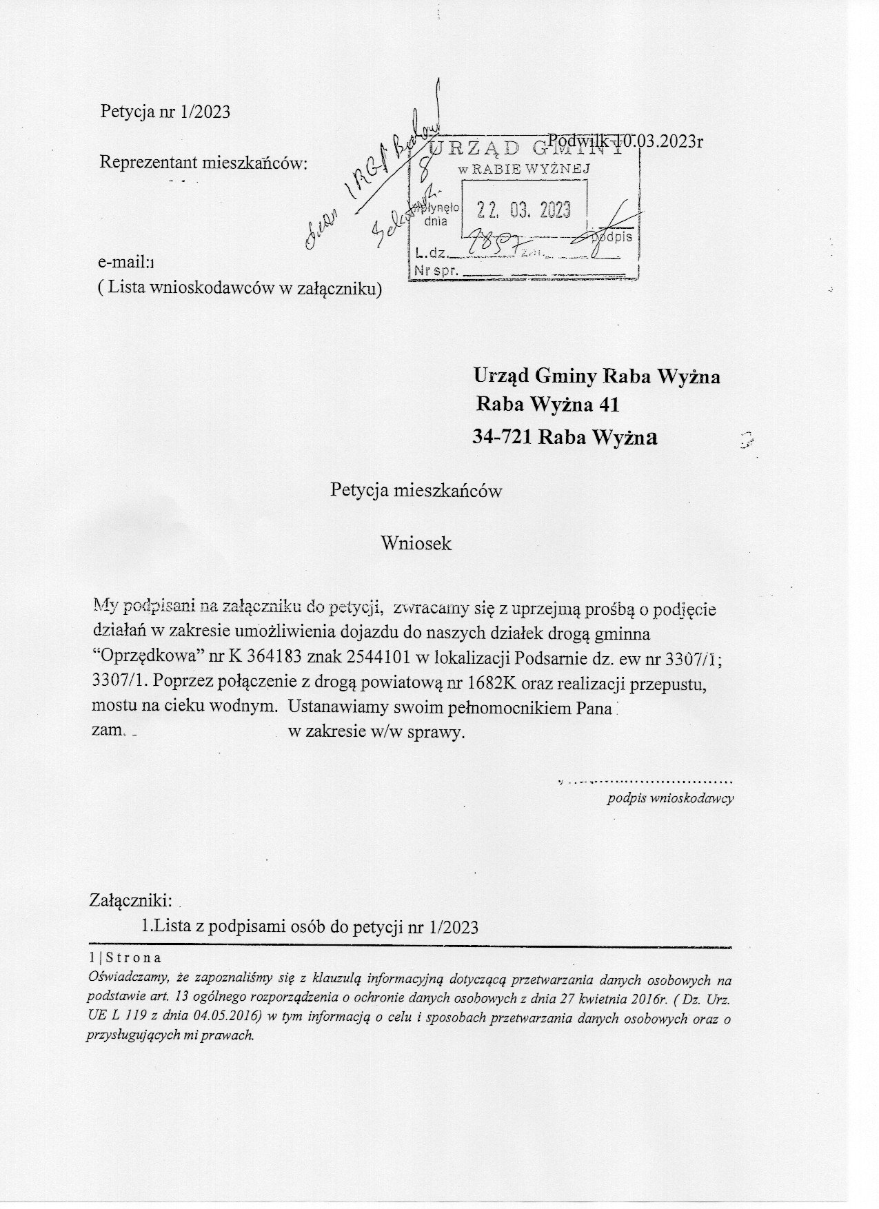 My, mieszkańcy niżej podpisani, zwracamy się z prośbą do Władz Gminy Raba Wyżna o przywrócenie chodnika przebiegającego od drogi powiatowej nr 1668K do rzeki Skawy, który prowadzi do osiedli Kozłówka, Opatkówka, Bielówka, Cieślówka i Głogówka, a także chodnika od drogi powiatowej nr 1668K do cmentarza. Wymienione odcinki chodnika były użytkowane przez mieszkańców, a szczególnie przez mieszkańców wyżej wymienionych ról, ponad 80 lat. Z tego chodnika korzystali do tego czasu mieszkańcy chodząc do sklepów, kościoła, pracy i na cmentarz, a w szczególności dzieci do szkoły.